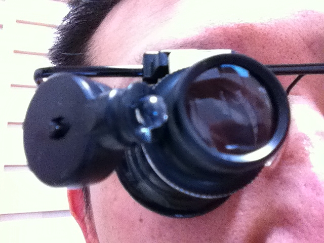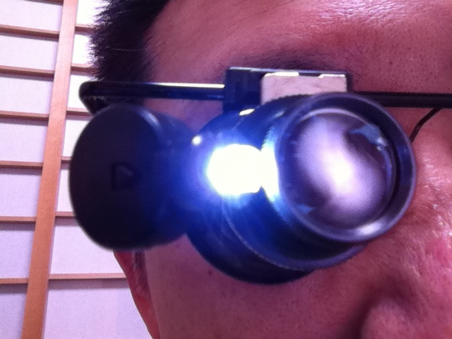 2月13日のライブの日に購入したものたち。 購入したもの其の① ライブ会場にて アルバム「クレッシェンド」の裏ジャケのデザインが そのまま印刷されたトートバッグ。 見た目よりもかなりしっかりしたつくり。 結構使えそう。 この日もこのあと紹介する購入したものたちを すべてこのバッグに入れて持ち帰ってきました。 購入したもの其の② ライブ会場にて クレッシェンドをモチーフにしたマグネット。 鳥が羽ばたいています。 購入したもの其の③ アキバにて 古い音源(カセットやMD)を簡単にデジタル化できるもの。 前からほしいと思っていたので購入。 しかもかなり格安。 そして最後、これが問題児。 購入したもの其の④ アキバにて なんだかわかりますか?? 装着イメージ図。 これはあやしい。。。 わかりますか?? 答えは眼鏡型拡大鏡です。 眼鏡型なので自由に両手がつかえるすぐれモノ。 しかもLEDライトがついてるのでとても明るい! 実はこのシロモノは数百円するのですが、 デジプロがブログに掲載するという条件で 半分出資してくれています。 なので、 装着させていただきます。 では、、、 装着感は悪くないのですが、 ピントがあうところがレンズからかなり近いポイントにあるので ちょっと使いづらいかも。。。 LEDライト作動。 かなりあやしいものになってしまったが、 デジプロとの約束は果たせたであろう。