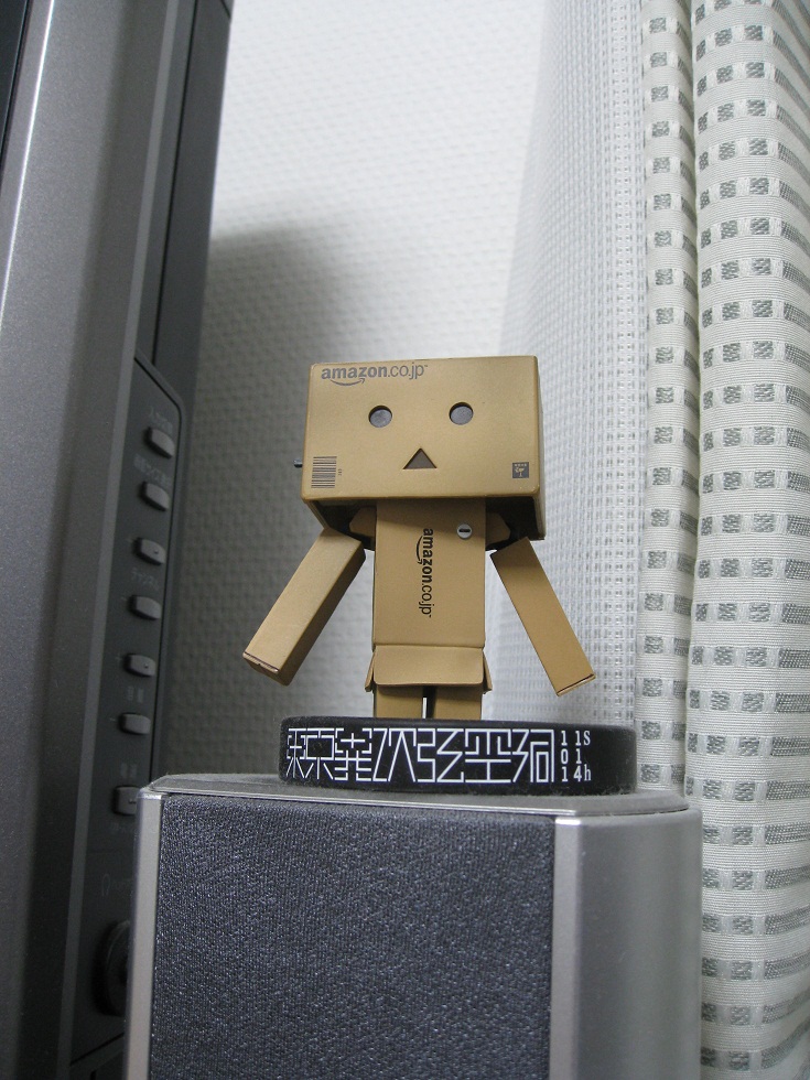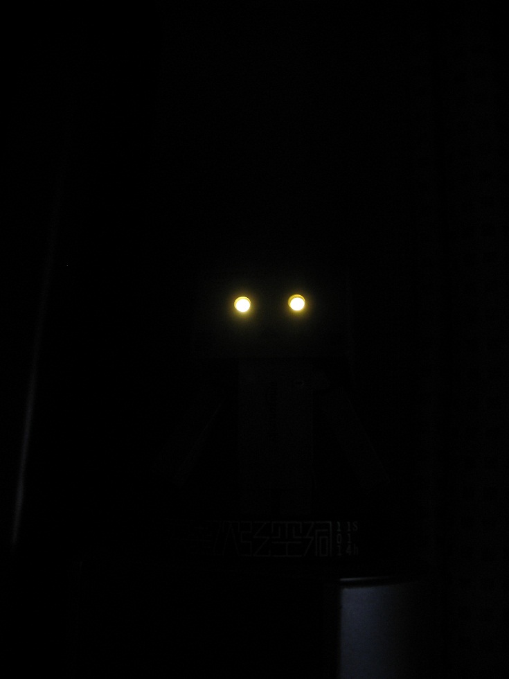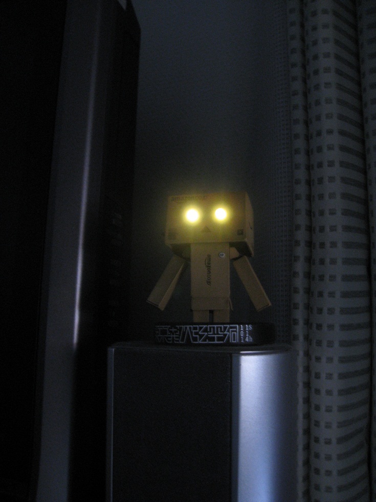 若干軽めのネタで 自分の机の”左斜め上にいるモノ”の紹介。 「ダンボー」です。 漫画「よつばと!」にでてくるキャラクターというかモノです。 テンションが高いあの漫画が好きで結構読んでます。 かなり笑えます。 オススメです。 この「ダンボー」リボルテック・amazon仕様 とてもよく出来ていて、 可動部分も多く、ギミック要素として目も光ります。 暗すぎてちょっとよくわからないですね。。。 なので、 室内パーティモードで撮影した画像で見ると こんな感じです。 結構いい雰囲気でしょ? 気にいったら”あなたの左斜め上”に設置してあげてください。