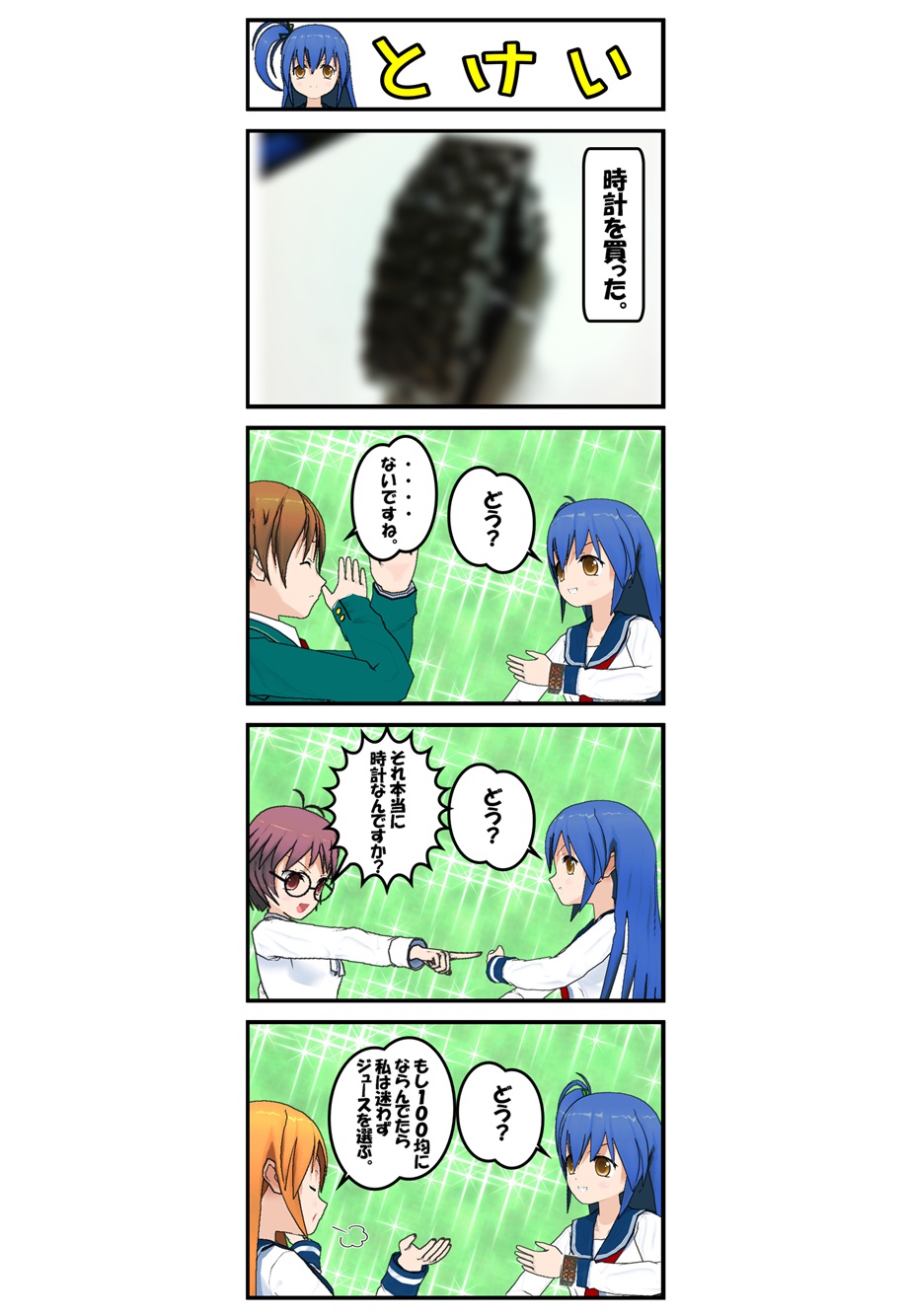第2弾 4コマ漫画製作完了。 一応解説。 少し前に時計を購入した。 自分はとても気に入ってるのだが まわりの反応はあまり良くない。 自分のまわりにいる人たちのセンスが 退化したとしか思えないのだが。。。 <最後の1コマ> これはデジプロの妹が言い放った言葉だ。 この場をかりて言っておく。 「デジプロの妹よ、センスを磨きたまえ」 では、公開。 また製作します。