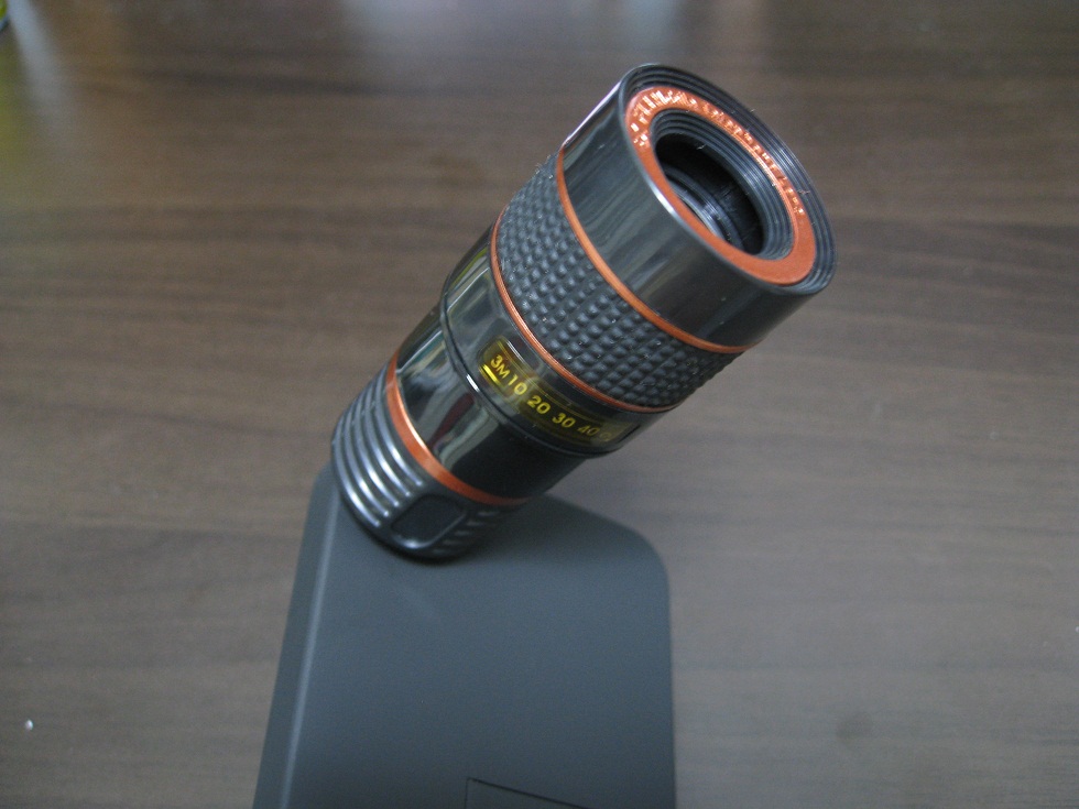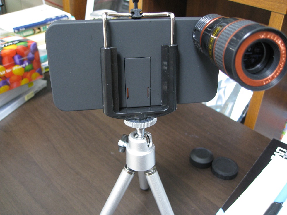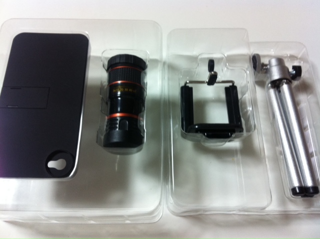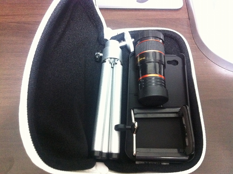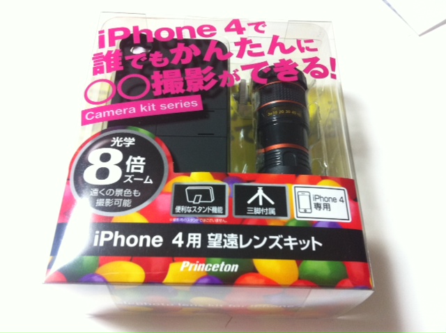 iPhone 4には光学ズームがない。 iPhone 4には三脚を取り付ける穴がない。 自分の中でiPhoneの使用頻度が以前に比べ格段に増加した。 インターネット、メール用途は勿論、カメラ機能としてもかなり使用している。 カメラとして使用するとき、せめて三脚は使用できるようにしたい。 よって これを購入した。 三脚機能つき8倍光学望遠レンズキット! 自分が求める両方の機能を兼ね備えたスグレもの。 さっそく開けてみる。 このホビー的な収納の仕方が心を躍らせる。 わかるかな? ガンダムフィギュアのパーツ収納に感じが似ているということ。 ではカスタマイズ。 まず本体に、付属のケースを装着。 次に望遠レンズを装着。 このカラーリングがまた良い。 最後に三脚を取り付け完成! これはもはやカメラでしょ! 望遠の威力をみよ! ↑ 標準 ↑ 装着後 すごいぜ! なにより装着した時のフォルムがすばらしい。 ただ、普段は現在使用しているお気に入りのケースを装着するので これを装着するのは旅行等でカメラ機能を頻繁に使用するときになる。 みなさんもこのフォルムと機能に惹かれたら購入してみるべし。 価格は2600円くらい也。