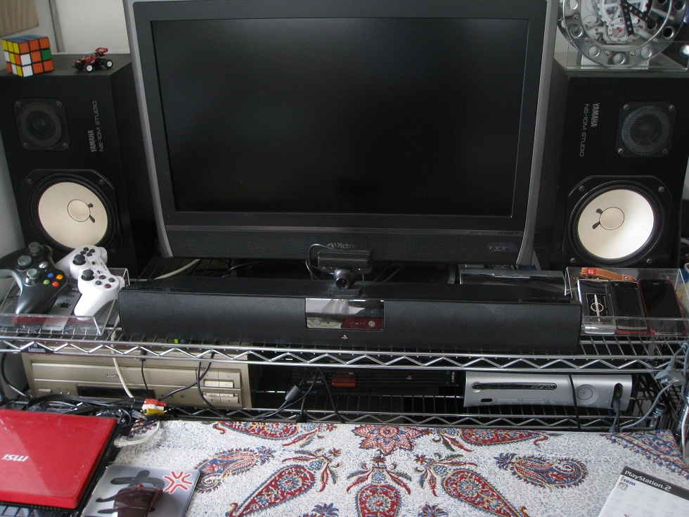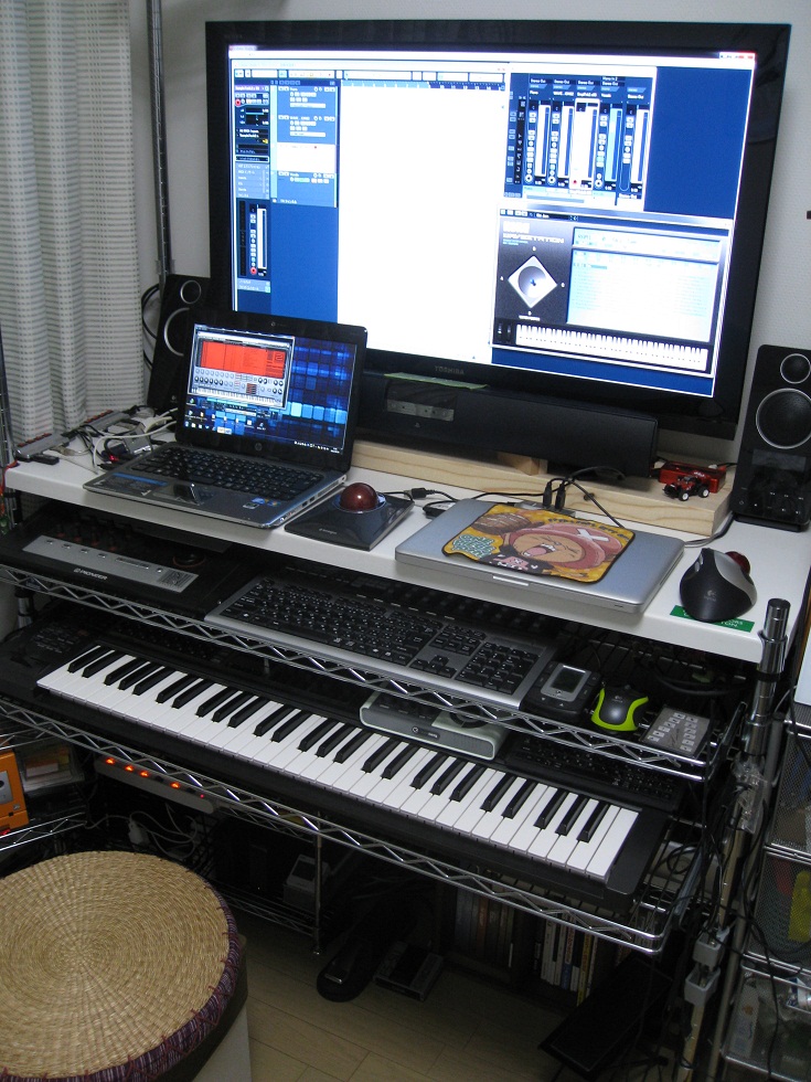 今だに部屋改装中。。。 なかなか終わらない。 TV周りはあらかた終了した。 大体こんな感じ。 TVの大きさを購入する時かなり悩んだが こちらを選んで正解だった。 スピーカーのサイズもピッタリ。 良い環境に変化。 DTMとは別の話で、 後で画像をUPしたいと思うが、 PSPを接続した時にこのTVはとても効果を発揮した。 ちょっとビックリ。 DTMゾーンとは反対側の改装も終わりつつあるのだが もう少しかかりそう。 また後日で。。。 今日は気温が高すぎてこれ以上の作業は無理。。。。